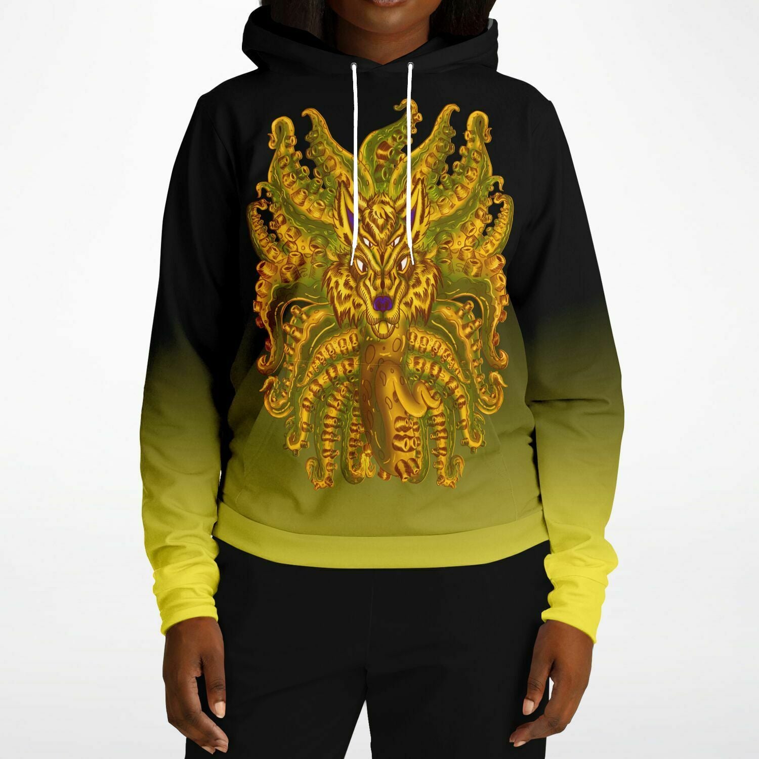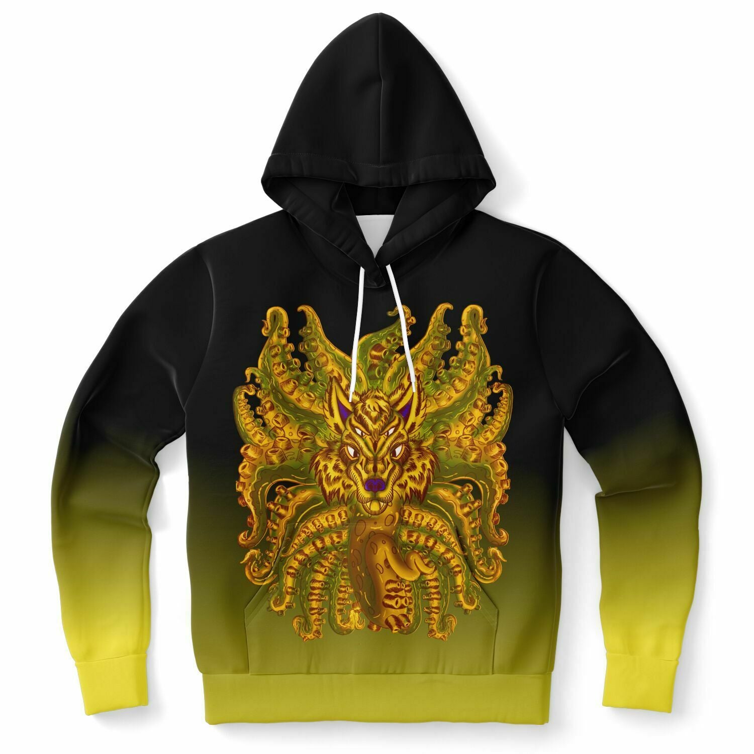 This comfy Golden Wolf Tulu hoodie is crafted from a premium polyester and spandex blend, making it both comfortable and durable. Each panel is individually printed, cut, and sewn to ensure a flawless graphic with no imperfections. And high definition printing makes these a pleasure to wear for all occasions. Wolf Tulu is a combination of wolf and Cthulhu, this hoodie is for those looking for bizarre art mixed with wolves and tentacles. The high-quality sublimation printing makes this a hoodie perfect for lovers of macabre decorum. The Golden Wolf Tulu hoodie has a relaxed fit, and it's perfect for wrapping yourself into on a chilly evening. Want an epic horror hoodie this fall and winter season? Then, the Golden Wolf Tulu hoodie is for you!