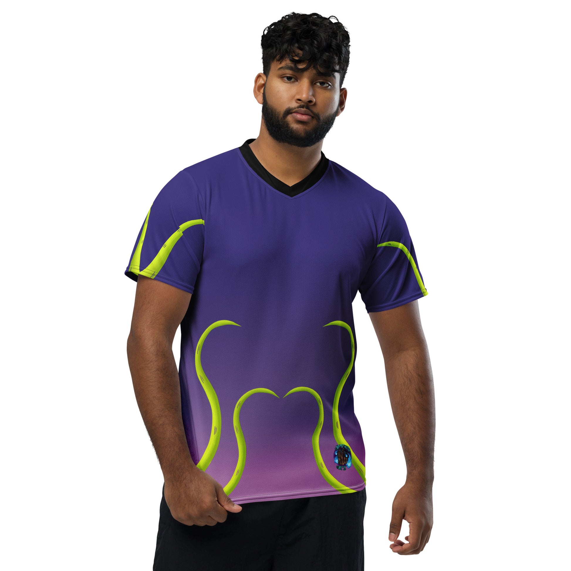 Looking for the perfect sports jersey? We have you covered—made of 100% recycled polyester fabric, this shirt is breathable, moisture-wicking, and has a double-layered v-neck collar that creates a premium look.